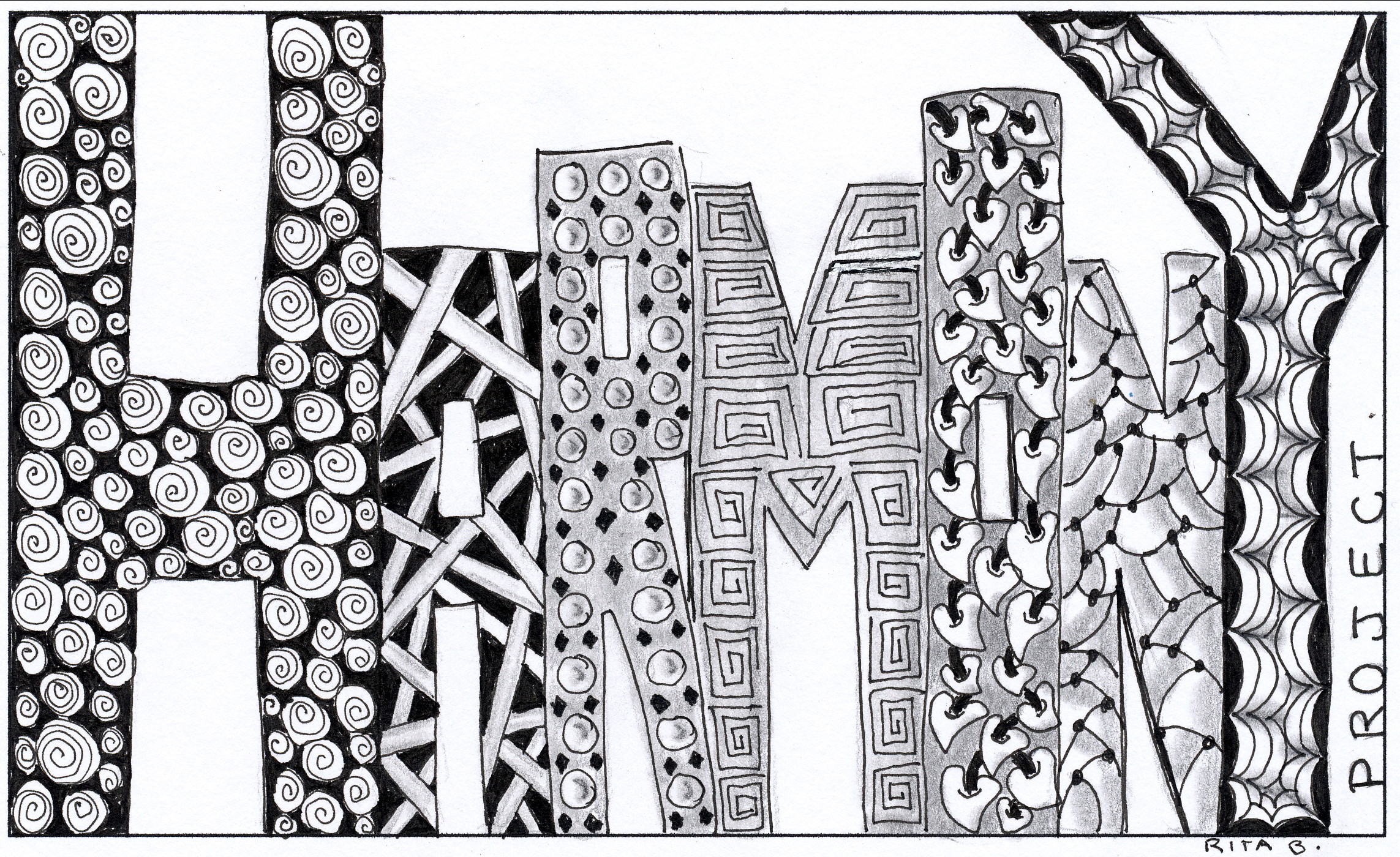 My ‘harmony’ drawing is a little bit of Op Art to illuminate the elusiveness of finding harmony and peace in our lives.