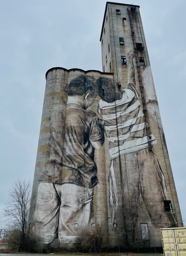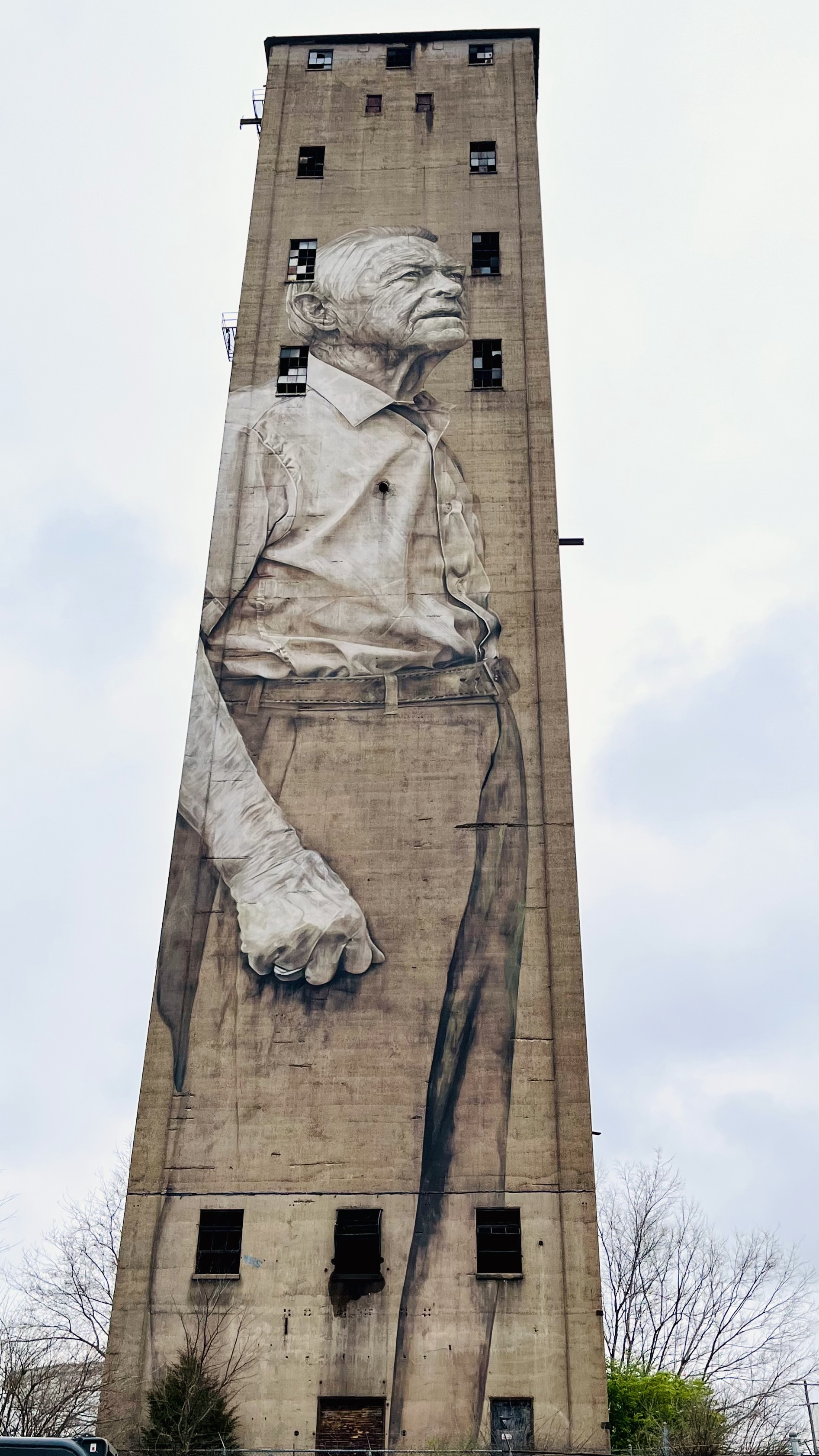 On a recent visit to Nashville, Tennessee, I discovered this amazing mural on the side of a 200 foot silo. It was painted in 2017 by Guido van Helten, an Australian and a former graffiti artist, who now specializes in monochromatic, photorealistic murals. The silo was formerly part of the Gillette Grain Company but now sits in an area of the city called The Nation. It is located on a bend in the Cumberland River. The subject of the art is Lee Estes, a 100 year old resident of the area.
